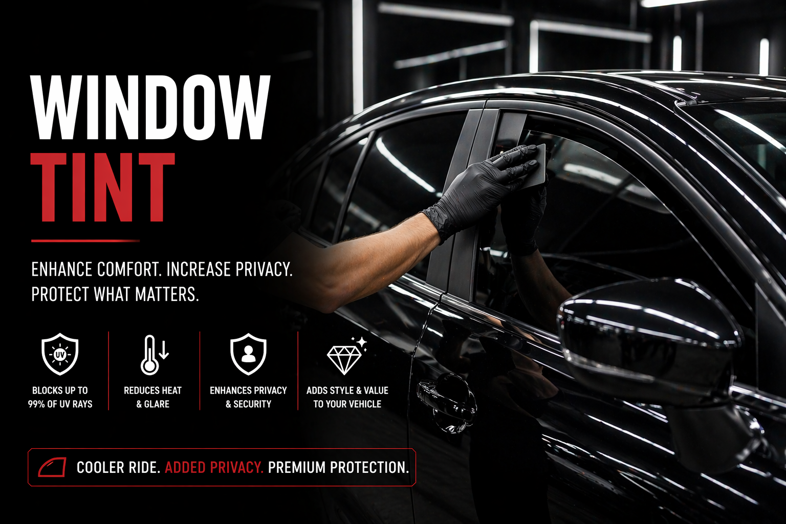 Upgrade your driving experience with premium window tint that reduces heat, blocks harmful UV rays, and enhances comfort.